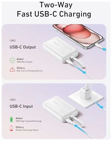 Recharge Ultra-Rapide 30 W – Grâce à la technologie de pointe d’Anker, cette batterie externe offre une puissance de recharge rapide allant jusqu’à 30 W, capable de propulser un iPhone 15 de 0 à 57 % en seulement 30 minutes. Que vous soyez en déplacement ou en voyage, cette fonctionnalité garantit que vos appareils seront rechargés rapidement, vous permettant de rester connecté en toutes circonstances.
