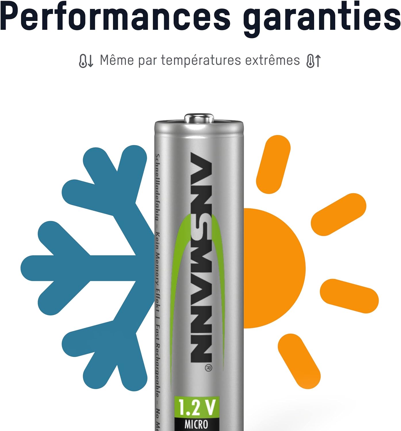ANSMANN Piles AAA Micro 550 mAh 1,2 V NiMH rechargeables – Les piles AAA Micro 550 mAh 1,2 V sont idéales pour une utilisation quotidienne avec les téléphones sans fil analogiques ou numériques, les babyphones, talkies-walkies, etc. Elles permettent de tirer les meilleures performances de vos appareils. Grâce à leur haute capacité et leur performances accrues, ces accumulateurs NiMH garantissent une longue durée d’utilisation. Leur technologie maxE limite le risque d’autodécharge et le divise par 10 par rapport aux accumulateurs NiMH classiques. Rechargeables jusqu’à 1000 fois et ne contenant aucuns métaux lourds, ces piles rechargeables sont respectueuses de l’environnement. Elles sont exemptes de risque de surcharge et de décharge profonde. Les caractéristiques du produit en détail : – Piles NiMH rechargeables – Utilisables avec les téléphones fixes sans fil, babyphones, etc. – Technologie maxE limitant l’auto-décharge – Piles rechargeables jusqu’à 1000 fois – Ne contiennent aucuns métaux lourds – Contenu : 1 x 4 piles AAA 550 mAh NimH 1,2 V