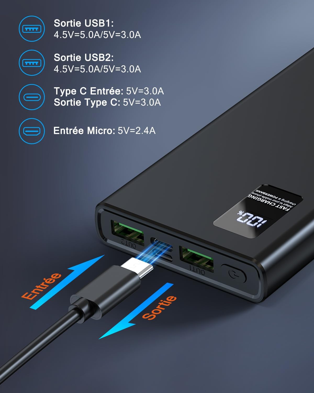 - Trois sorties & double entrée: Sortie USB-C 15W (5V/3A)+deux Sortie USB (5V/2A), supporte le chargement simultané de trois appareils, si vous avez trois appareils, vous n'avez pas besoin d'attendre ; Puissante puce intelligente, identifier intelligemment les appareils , en fonction de La puissance restante de l'appareil distribue automatiquement la sortie actuelle de chaque port pour atteindre la vitesse de chargement la plus rapide ; USB C & Mirco USB deux entrées vous facilitent le chargement du powerbank