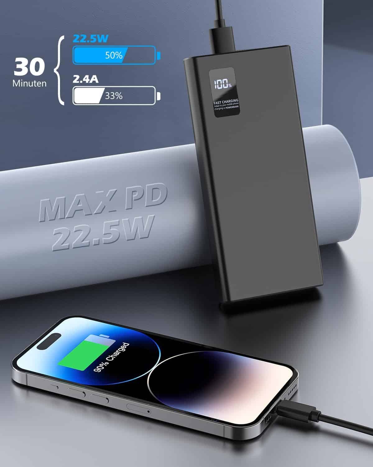 【La Dernière Technologie de Charge Rapide de 22,5 W】Chargeur Externe Avec la puissance améliorée de 22,5 W et la dernière technologie de charge rapide PD3.0 et QC4.0, votre téléphone peut être chargé de 0 % à 52 % en seulement 25 minutes. Trois fois plus rapide que l’ancienne batterie externe portable de 10 W.