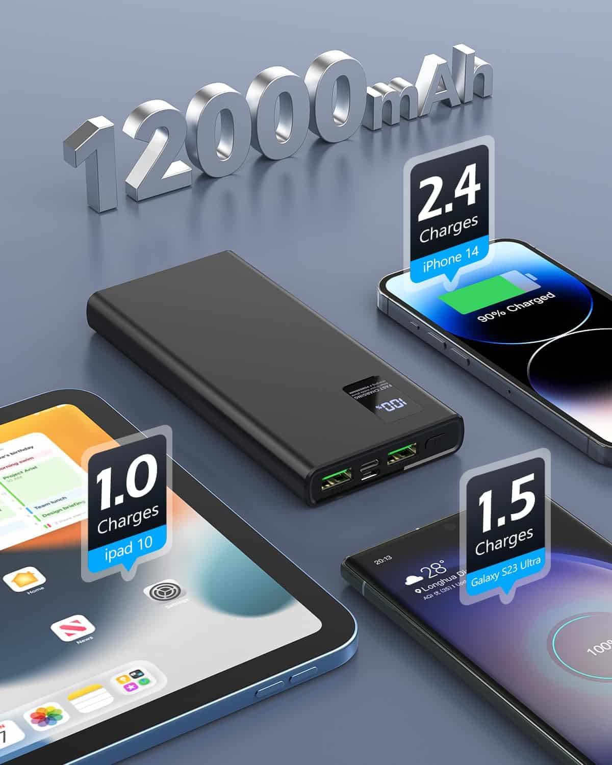 【Batterie Externe 12000mAh Grande Capacité】La batterie 12000mAh fournit 2.4 charges complètes à l’iPhone 14 pro 2 au Samsung Galaxy S23, 1.5 à l’iPad mini, permettant à 3 téléphones portables de fonctionner toute la journée. Un incontournable pour les randonneurs, les grimpeurs, les campeurs et une grande famille.