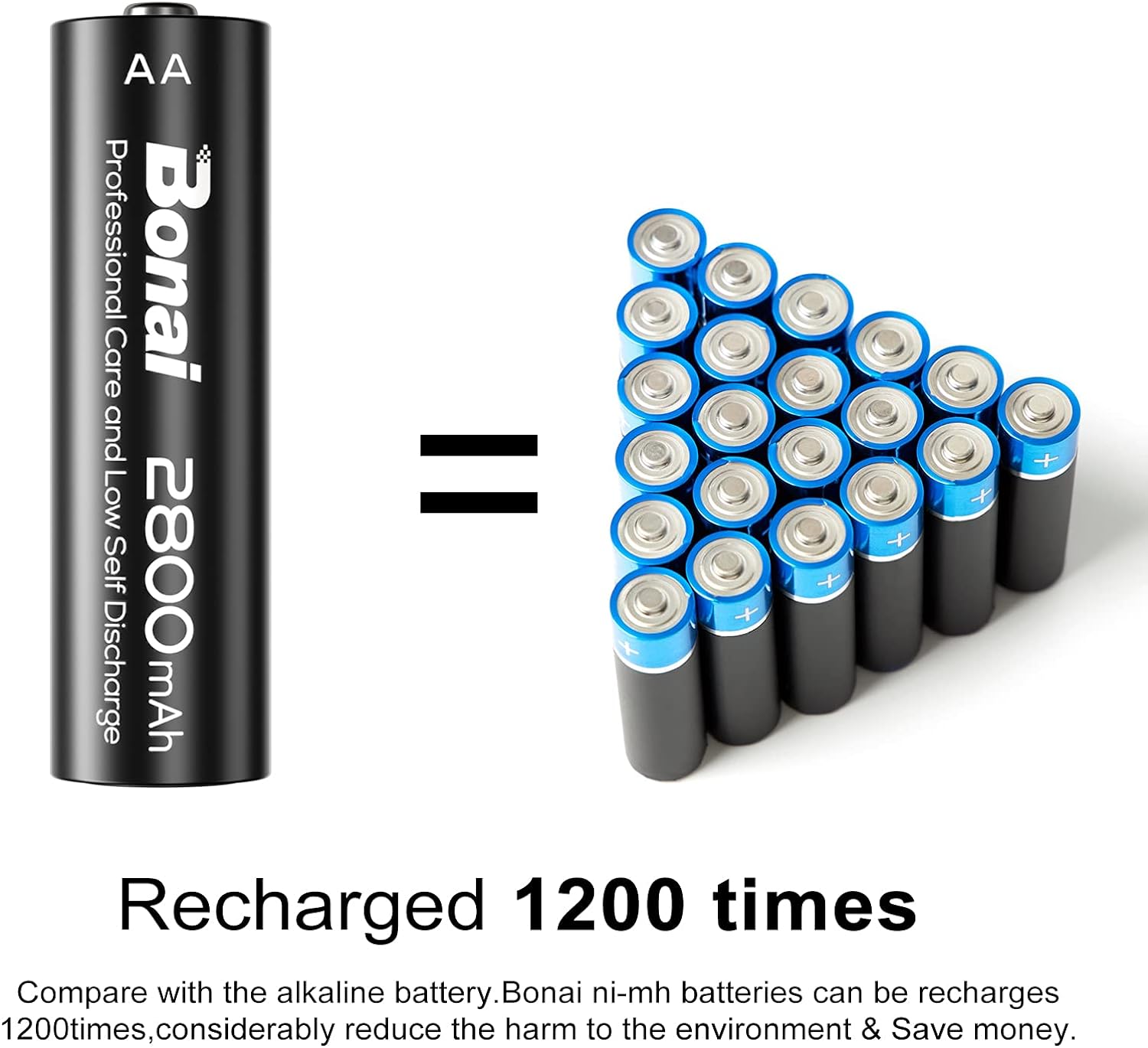 Les piles AA rechargeables Bonai offrent une excellente conductivité et durabilité et peuvent être rechargées jusqu’à 1200 fois.les batteries rechargeables ne sont pas complètement chargées à l’arrivée, veuillez les charger à 100% la première fois que vous les utilisez. Après 3 à 5 fois de charge complète, les batteries atteindront les meilleures performances