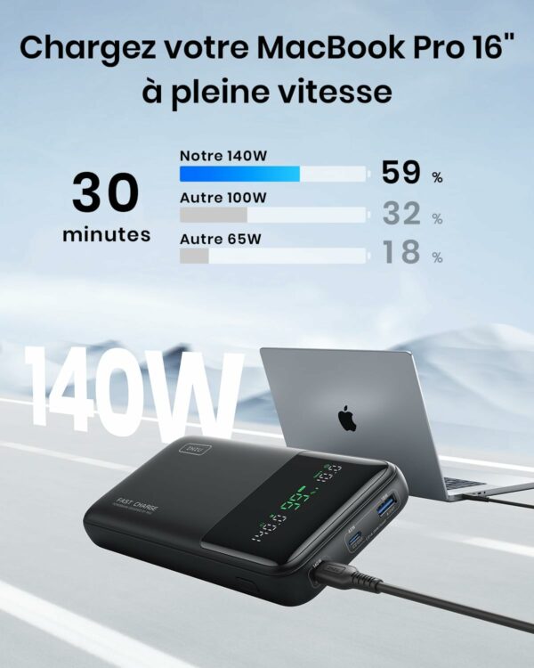 ✅【140W PD 3.1 Super-Fast Charging】 Alors que d’autres se battent avec 65W ou même 100W, notre 140W PD 3.1 PowerNova est assez rapide pour alimenter tous les appareils à forte demande d’énergie comme les ordinateurs portables et le SteamDeck. En seulement 30 minutes, vous aurez un MacBook Pro 16″ à 59 %, un SteamDeck à 57 %, un iPhone 15 Pro Max à 71 % et un Samsung S23 Ultra à 75 %.
